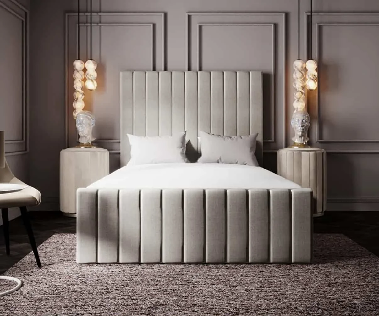 The Stratton Linear Winged Bed blends stylish design with discreet storage. Upholstered in elegant grey naple velvet, it features a modern look that remains timeless through changing trends. Its neutral tones make it a versatile fit for any home, adding a luxurious touch to the master bedroom.